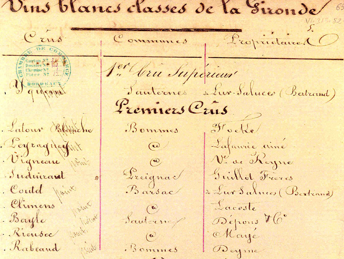 Ainsi, le 5 avril 1855, la Chambre de commerce adressa au Syndicat des courtiers une lettre demandant, je cite, « une liste de tous les crus classés de vin rouge du département, aussi exacte et complète que possible, précisant à laquelle des cinq catégories appartient chaque domaine et dans quelle localité il est situé ».